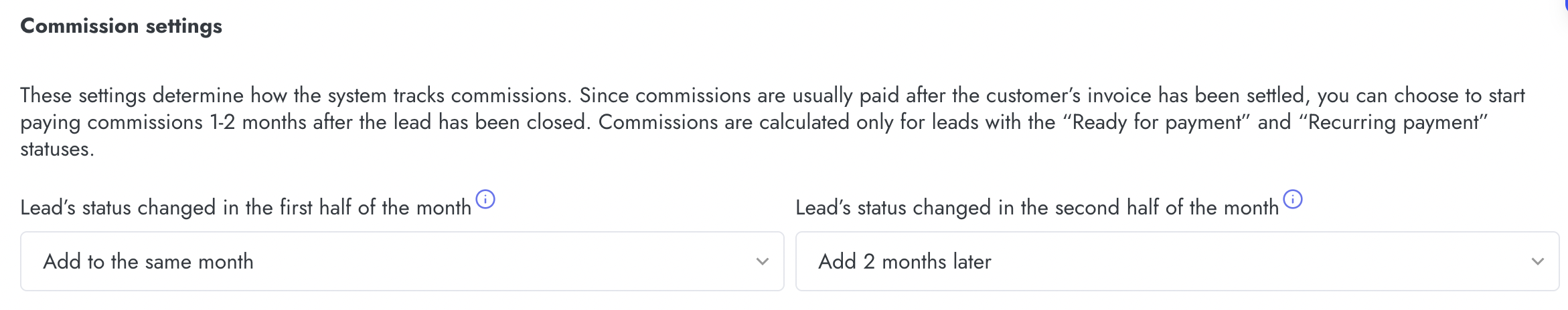 Example: If a lead status is changed to "Ready for payout" on January 16th, the commission will appear in the March settlement period on the invoice management page.
