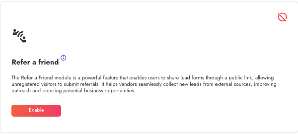 The Refer a Friend module is a powerful feature that enables vendors to share lead forms through a public link, allowing unregistered visitors to submit referrals. This feature helps vendors seamlessly collect new leads from external sources, improving outreach and boosting potential business opportunities by leveraging existing partner networks and customer relationships.