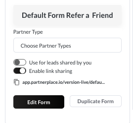 - After enabling link sharing, a unique link will appear below the toggle, typically in the format "app.partnerplace.io/"YOURFORMLINK"" or similar. This is your form's public referral link that you can copy and share with anyone.