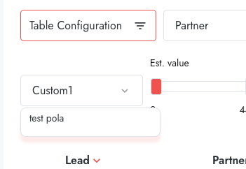 | 4. Enable Column | Open Table Configuration, find Custom1, toggle ON | Custom1 column appears in lead list to right of Stage |