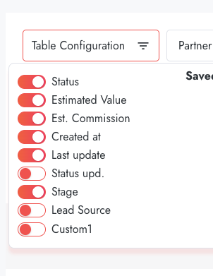 - Standard columns: All other enabled columns (Lead, Partner, Status, Est. value, Est. Commission) remain visible