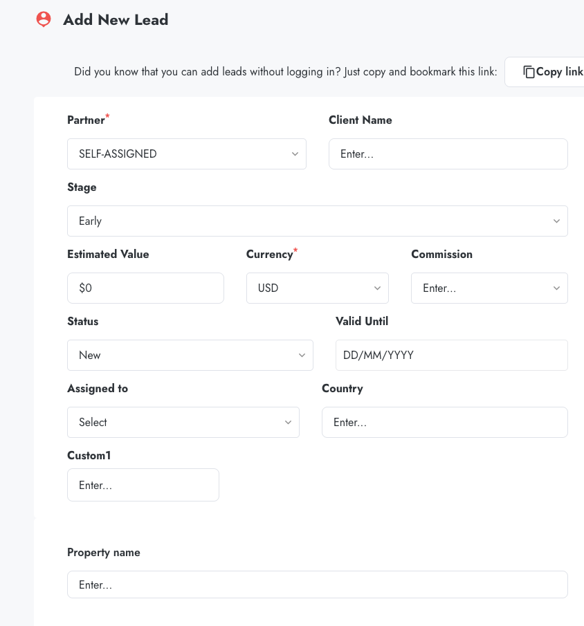 - Navigate to Add Lead (click the Add Lead button or menu item)